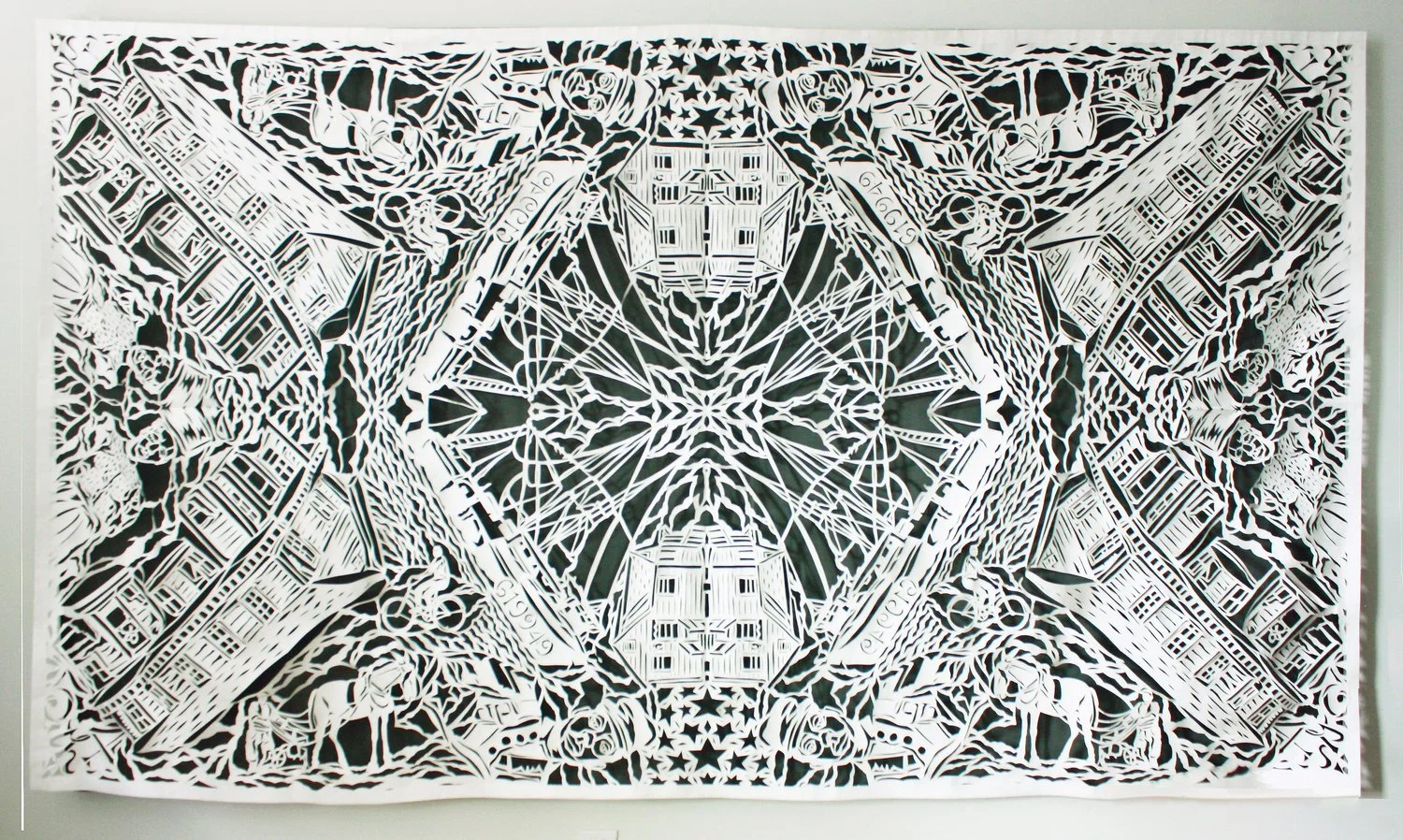 I run many mornings with eyes wide open in awe of this incredible world. I sit and draw, filling my sketchbooks with observations. Then I layer my drawings and intricately cut paper into castaway vessels such as suitcases and mirrors, or build them into even larger snowflake papercuts of tyvek house wrap. With pen and knife, I invent wondrous new stories in ink and paper.