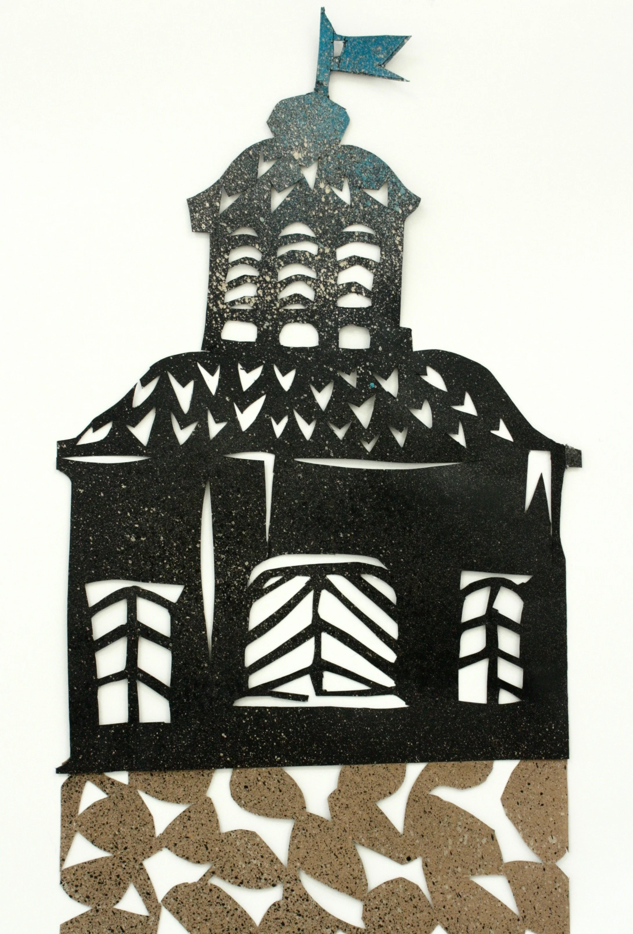 I was an artist-in-residence in Kristinestad, a quaint little shipbuilding town on the Baltic Sea in Finland for the month of August 2019. I cut the facade from card stock paper from direct observation in the street in front of “Ulrika Eleanora,” the most kooky and fascinating church I’ve ever been in! Also, in Kristinestad, the terrain is very rocky, and many structures date back to the 1600s, many sit perched on the rocks.